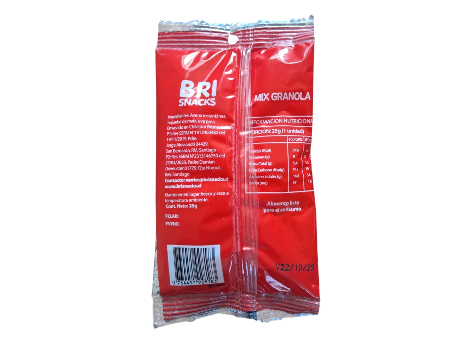 Granola mix en formato de 25g. Colación ideal para mediodía o media-tarde. La porción correcta recomendada por nutricionistas para tener una dosis de energía y fibra adicional